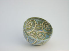 A mixture of my swirls and cherry designs. Thrown, slumped or hand built in off white stoneware clay with a grey/blue glaze.